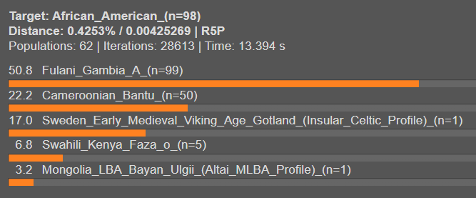Where did Mongolia come from? I assume that’s the Native American bit?I was shocked to find that the bulk of the West African ancestry of African Americans was majority from the Islamic region, whereas the Nigerian region was less emphasized. The 30% is a good starting point, but the actual rate of Muslims could be higher. The rest is around 28% Bantu.