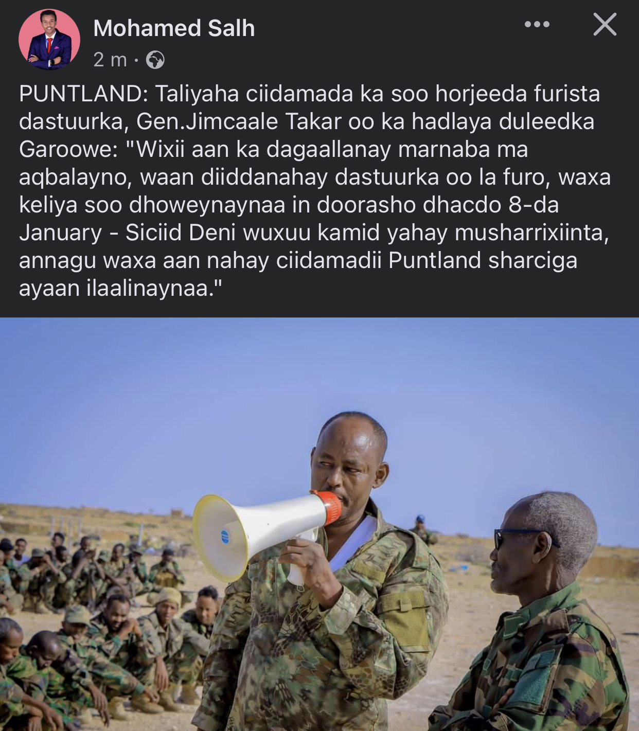 "Doorasho la qabtay dastuur looma furi karo... Madaxweyne Deni iyo Af-hayeenka Baarlamanka ayaa qaadaya mas'uuliyadda dagaalkii Garoowe, ujeedadooduna waa muddo-kororsi."