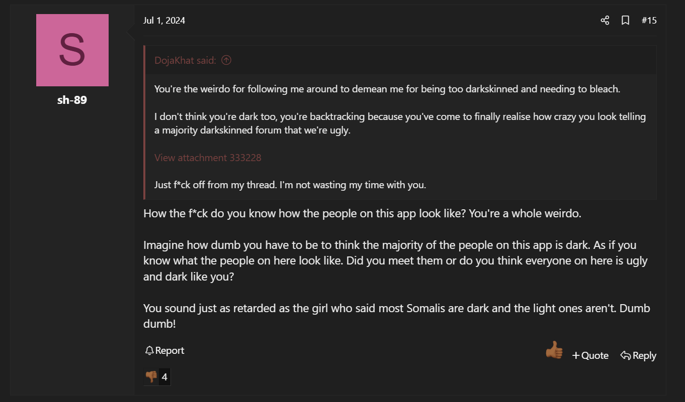 I told her to stop being colourist one day to the dark-skinned majority on SomaliSpot and she replied something to the effect of "How do you know most Somali users on here aren't lightskins, huh?"