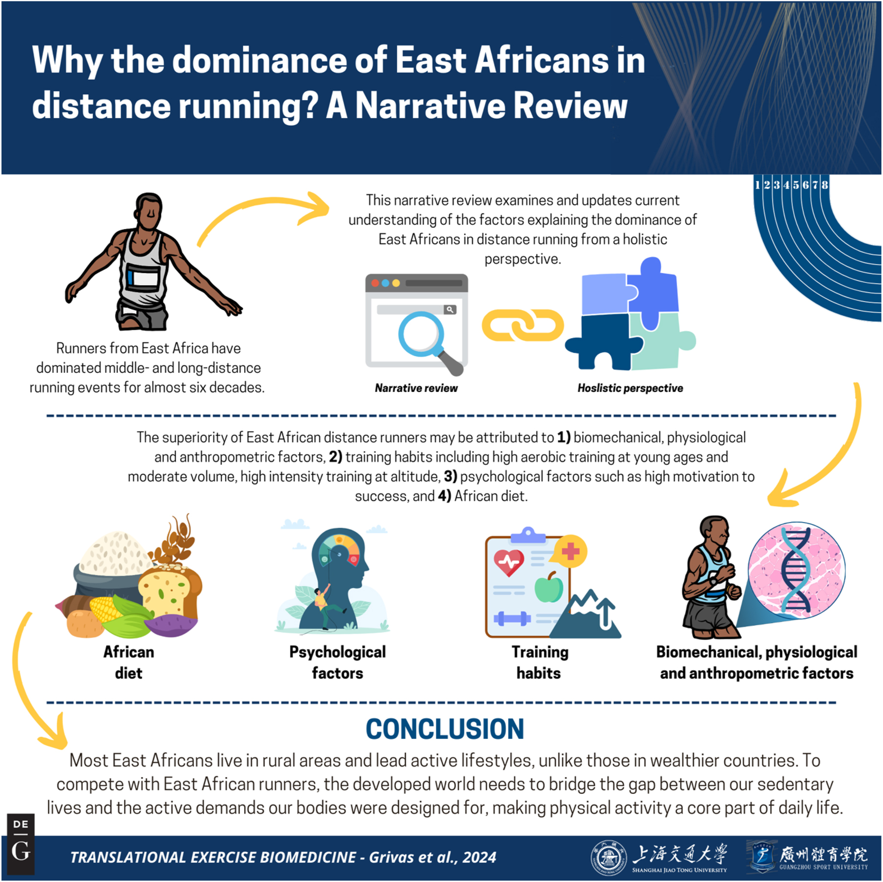 Runners from East Africa often exhibit ectomorphic somatotypes, characterized by lean body compositions which lead them to an extraordinary biomechanical and metabolic efficiency. Their sociocultural lifestyle, training regimens beginning at a young age with aerobic activities, seem crucial, as well as moderate volume, high-intensity workouts at altitudes ranging from 2,000 to 3,000 m. Psychological factors, including a strong motivation to succeed driven by aspirations for socioeconomic improvement and a rich tradition of running excellence, also contribute significantly. A multifactorial explanation considering these factors, without a clear genetic influence, is nowadays the strongest argument to explain the East African phenomenon.