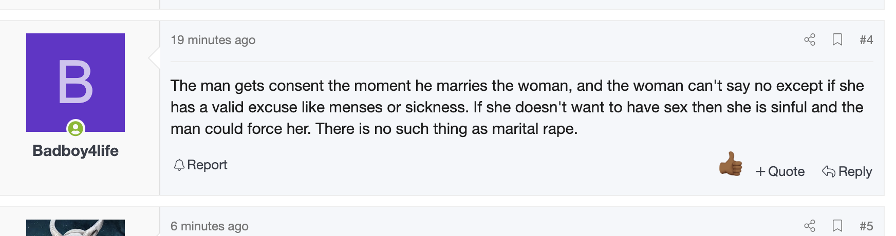 In the West, if a man beats his wife or forces his penis into her, she can get him arrested. In a Muslim country, forget about it. They don't even recognise that she got abused in the first place.