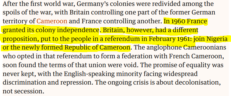 British Cameroons (BR Cameroons) - the major question was whether to remain with Nigeria or to unite with the newly independent Republic of Cameroon. In a UN-supervised plebiscite in February 1961, the south decided to unite with the former French Cameroun, creating the Federal Republic of Cameroon. The north voted to join the Federation of Nigeria.