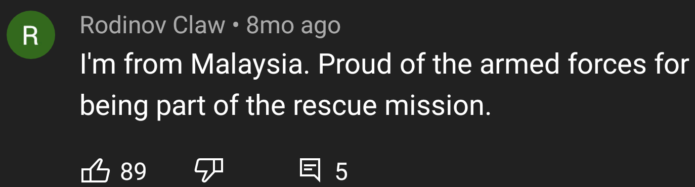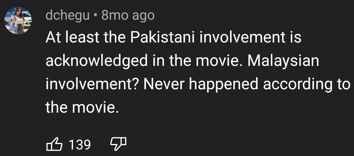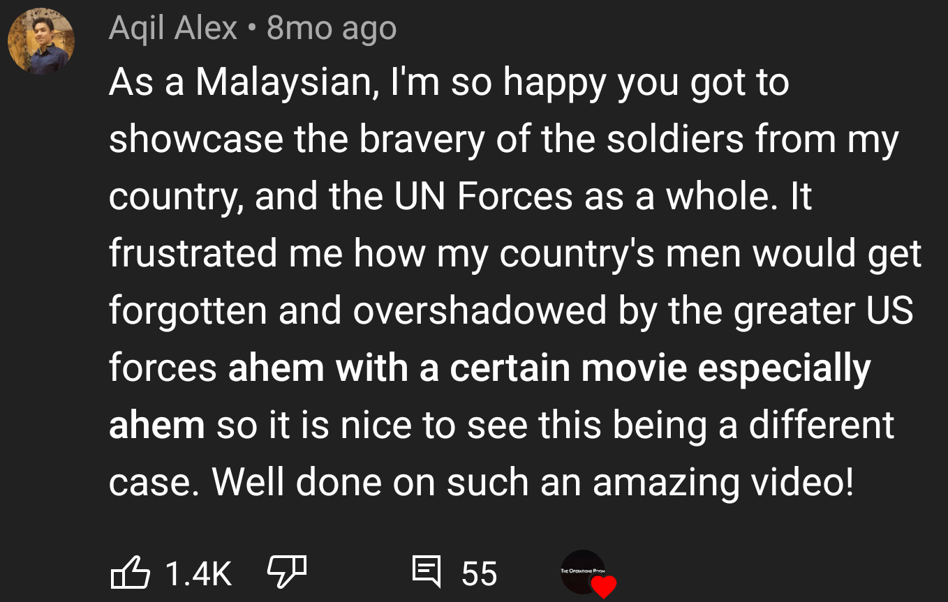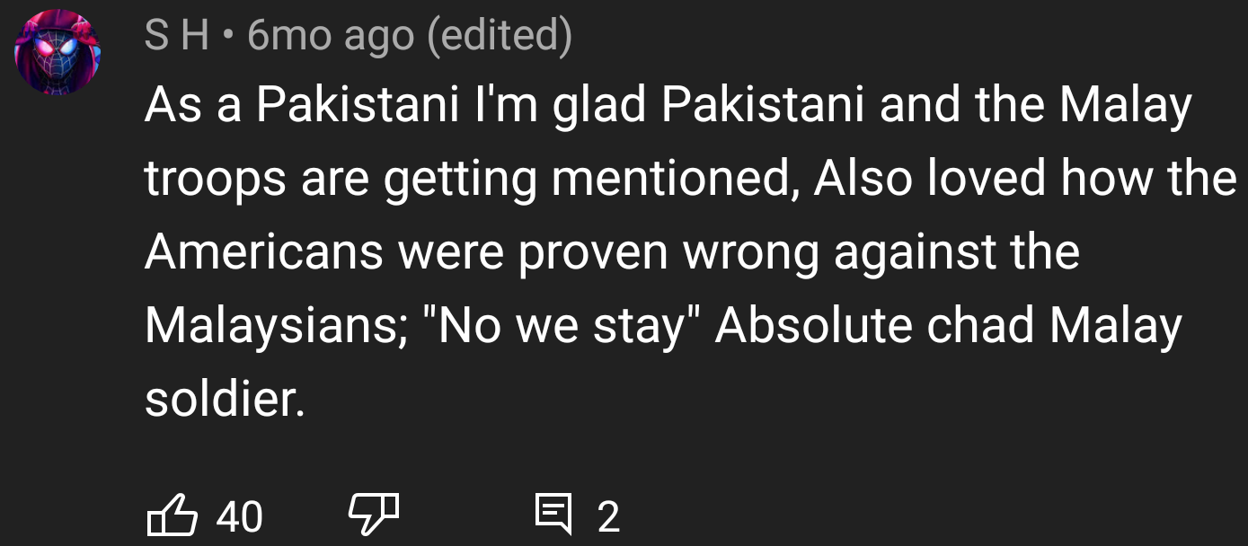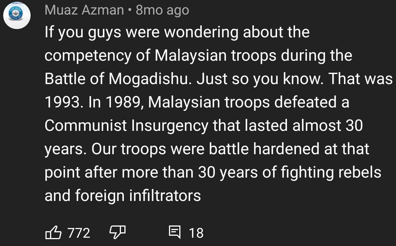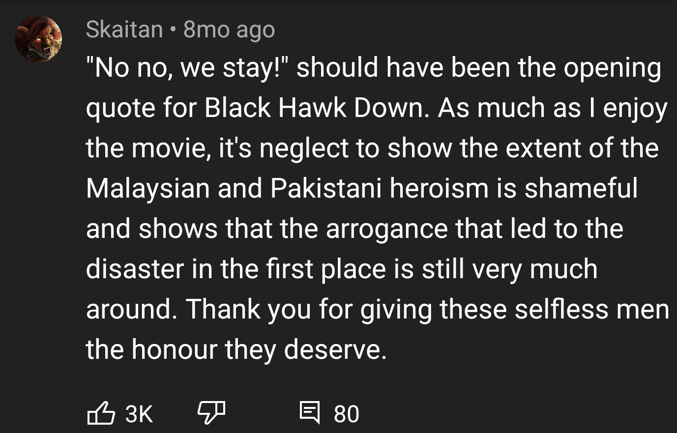 Malaysians and Pakistanis, under every Black Hawk Down related video, are bragging about their involvement in the Battle of Mogadishu and are demanding recognition from the Americans and to be thanked for how they helped daba-cad soldiers escape from the Somalis and how their soldiers killed thousands of Somali civilians in the process. Even the Malaysians gov. pressured US officials to publicly express their gratefulness to the Malaysian people and reprimanded US gov for not including Malaysia's role in the war in the Black Hawk Dawn film. But the US didn't answer to all that and completely ignored them.