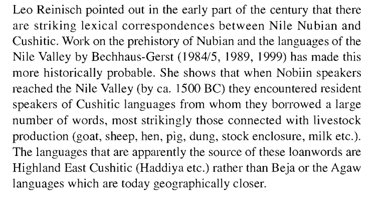 I believe the Eastern Cushitic languages were in the Nile Valley/Eastern Desert. It’s highly likely that we came with proto-Somali from Sudan, and those East Cushitic languages went extinct later. We know that there were several groups in the area in the ancient past that was difficult to associate with a specific group. I read that Nubian had loanwords with Highland East Cushitic, not Beja or Agaw: