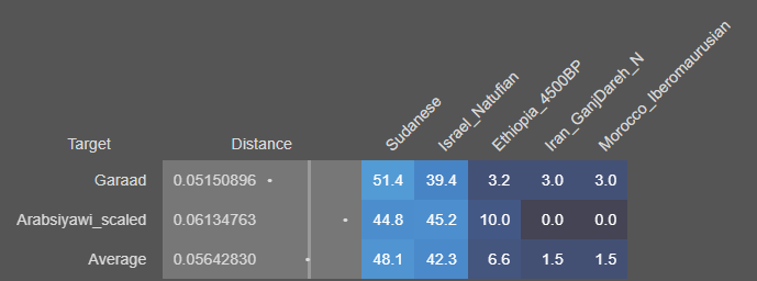 @Canjeeroiyoshaah correction, in my model my father scores only 4% . He has less Arabian ancestry than me and my mother hence the low Iran_N. My mother has no Mota ancestry.