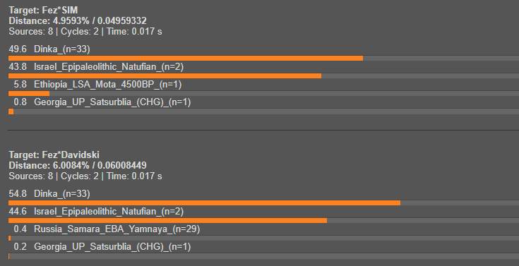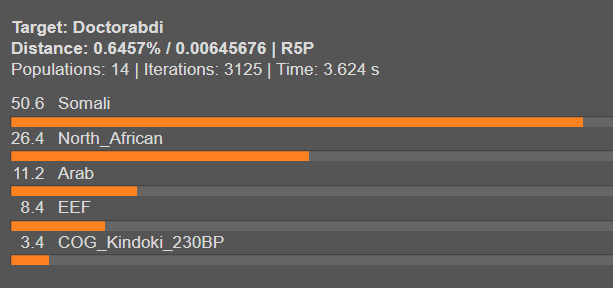 Makes sense, is there a difference between my actual g25 cords and the simulated proxy ones? I'm not well versed in g25 as well as you sxbHis AncestryDNA is not that reliable when it comes to Arab-specific values. They took a whole North African ancestral complex with pre-baked Arab genetics. His Arab DNA proportion is not markedly higher than full Maghrebi Arabs, making it not out of the ordinary. His father, on the other hand, will express a general relative increase.