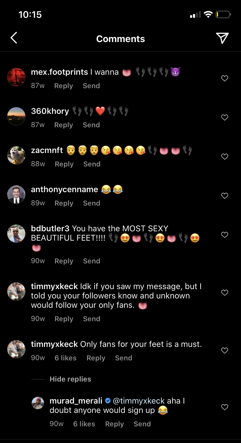 The comment sections on his older post has people constantly talking about his feet. Almost half of his followers are a bunch of weird foot fetish accounts, it was right in front of everyone the whole timeeeeeeeee omgggg.