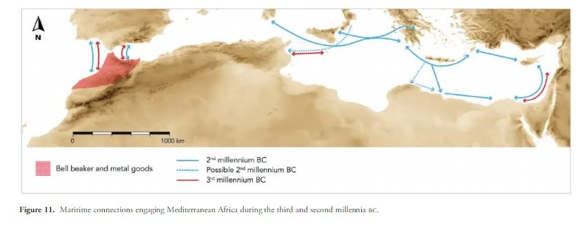 From the fourth millennium onwards one can begin to see contacts with the Mediterranean islands and with the Iberian peninsula: obsidian from Lipari appears in northern Tunisia, while shell-decorated pottery and, at the beginning of the bronze age, bell beakers similar to Iberian types are found in northern Morocco. In the high Atlas numerous engravings of Iberian daggers and halberds attest that contacts continued throughout the bronze age. [...] Dolmens in northern Tunisia and eastern Algeria recall Maltese prototypes, while late bronze age chamber tombs on Cap Bon have clearly Sicilian origins. [...] The North African tell at the beginning of the second millenium thus presents a picture not very different from the rest of the western Mediterranean: farmers with a strong pastoral element in their economy and fairly elaborate cemeteries.
