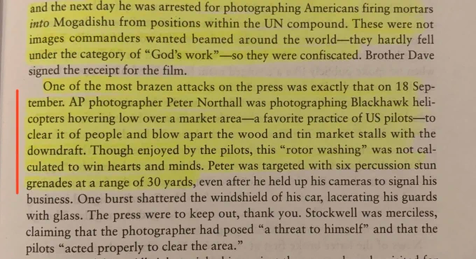 So when you hear the guy in the trailer say he was happy that the helicopters came down as @Midas pointed out, it was because American Black Hawk pilots consistently made deliberate effort to antagonize Somalis and even assaulted an Associated Press photographer who tried to document it.