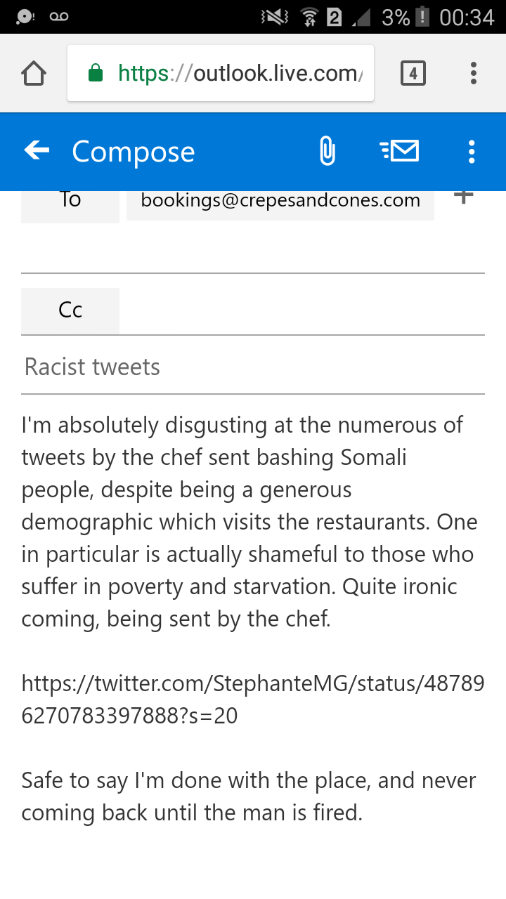 Ladies and gentleman i just want to say this successfull black man works at a very succesful top restaurant and is a chef at crepes and cones with nearly 4,000 followers and has quite a few somali followers supporting him YET he is here ridiculing us and yall beg it with these people? cant relate and could never be me but go ahead and support him by REPORTING him to crepesandconesbookings@gmail.com do your thang and let him not get away with it bastaarka xuun