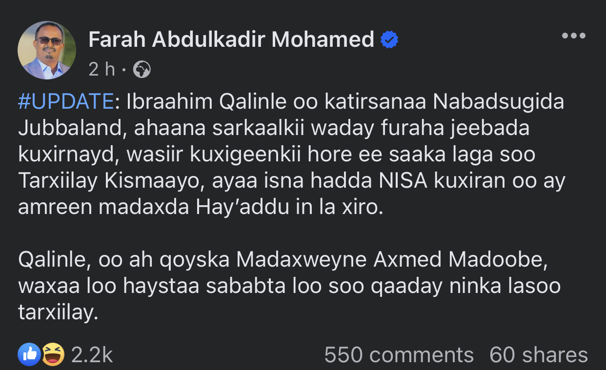 Sxb calm yourself, the raxanweyn community in jubbaland is always in fear of daarod. Outside of SWS and Xamar you guys are shit. We might be forced to take unprecdented action in jubbaland.This is good. Who does Axmed Madoobe think he is to tarxiil a Somali from Somali land. More OGs need to be locked up in xamar for this