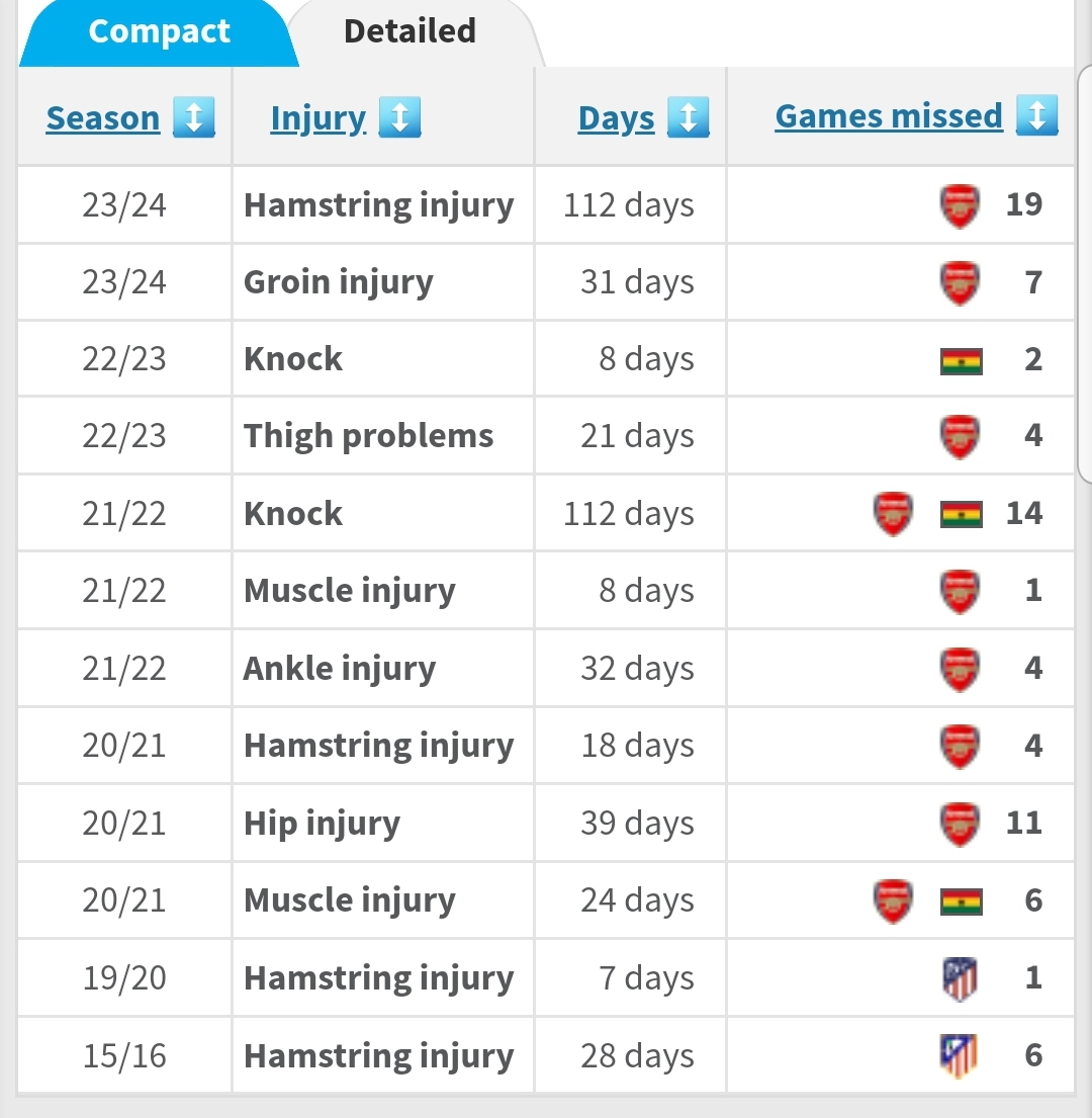 Partey injury record and he was at atleti since 2013. I thought the cursed medical team left with arsene yet they're still here