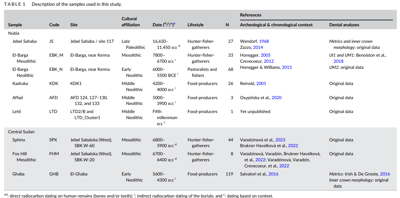 "Despite an ostensible resemblance to Sub-Saharan Africans in 26 out of 30 observations, the worn, largely incomplete dentitions are only from three individuals who mayor may not be representative of the general Nabta Playa population. A proper biological affinity estimate based on dental morphological data requires a larger sample, using more traits from both the mandible and maxilla (Turner 1985; Irish 1993; 1997, 1998a, b, c, d for examples). Furthermore, in the case of E-97-17, the small teeth with fine roots, interpreted here as female indicators, could be suggestive of a North African linkage; North Africans often exhibit reduced, morphologically simple teeth (Irish 1993; 1996; 1998a, b, c, d). Thus, these initial results should be viewed with caution."