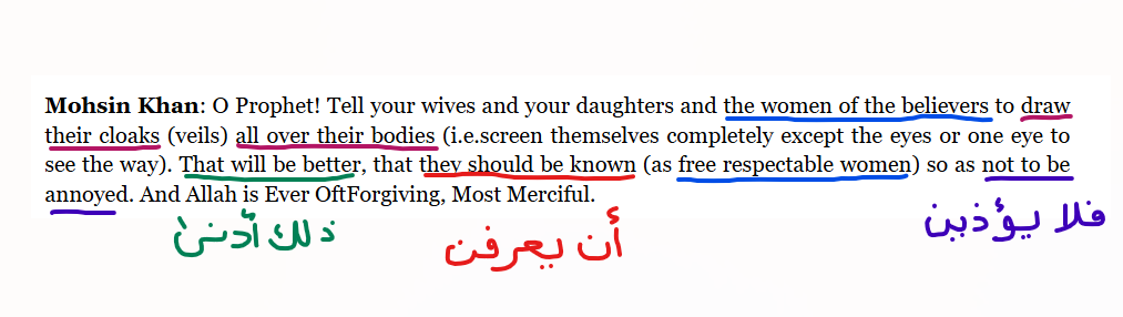 Do you know what this part at the end of the verse means " That is more suitable that they will be known and not be abused " "ذَٰلِكَ أَدْنَىٰ أَن يُعْرَفْنَ فَلَا يُؤْذَيْنَ" ?