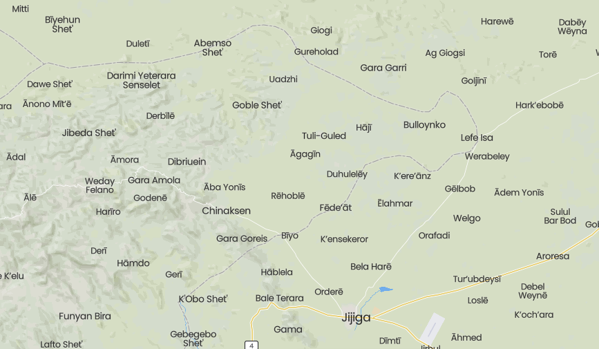 Or from an actual map, to get a further clear view of the outlining of "Chinaksen/Jinacsani district (woreda)".
