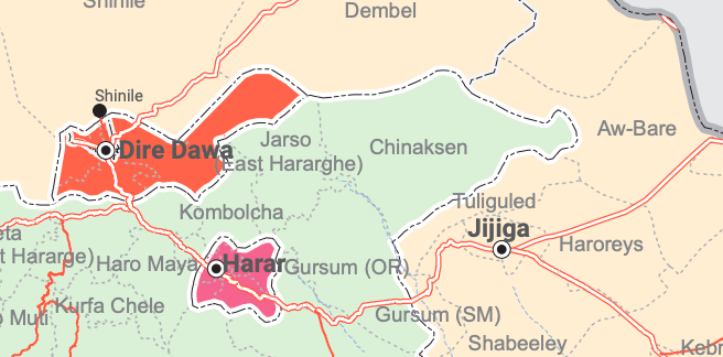 Even worse to the areas where Geri/Jarso live. Here's the offical map of Ethiopia, and zoomed in to the area in question.