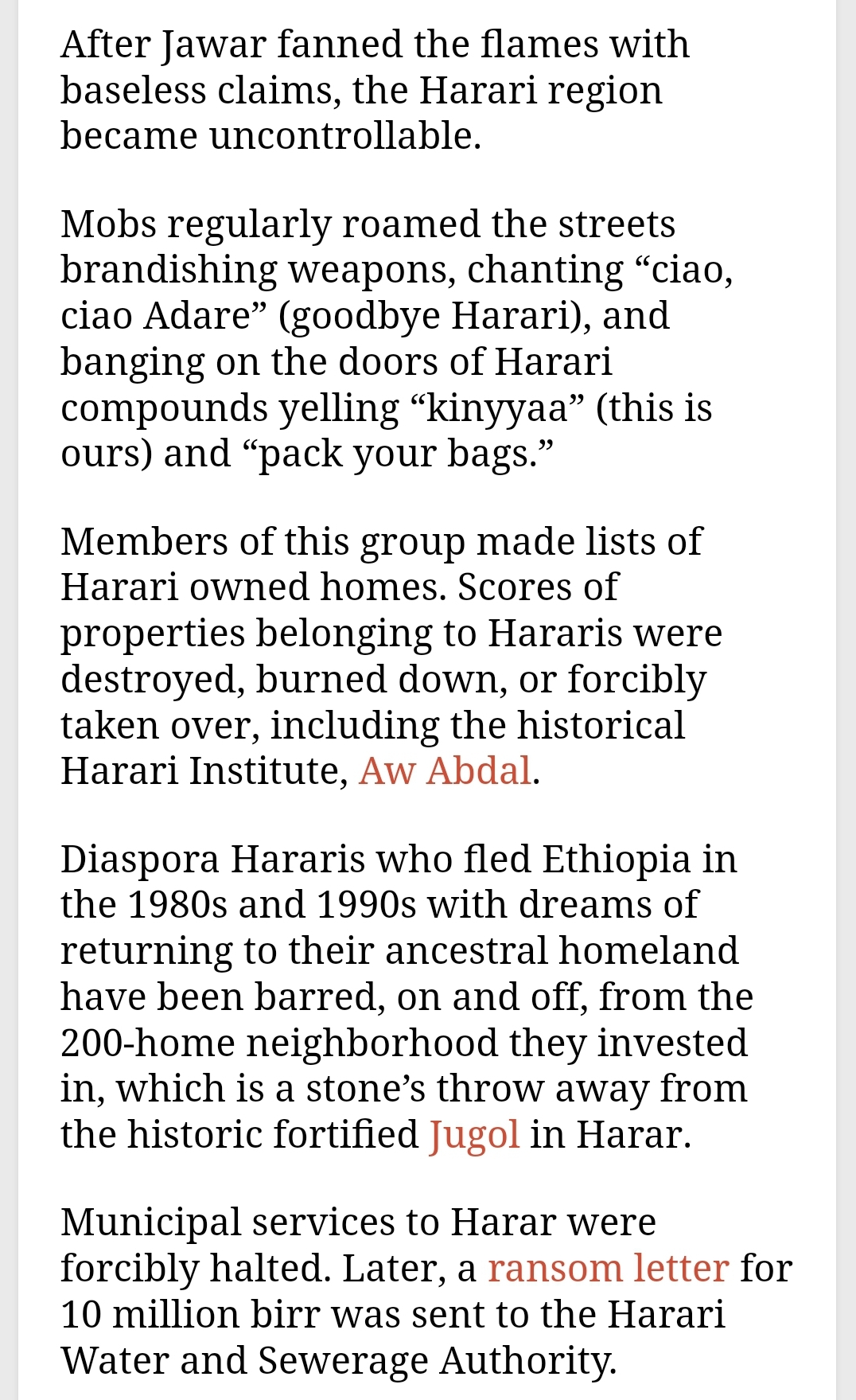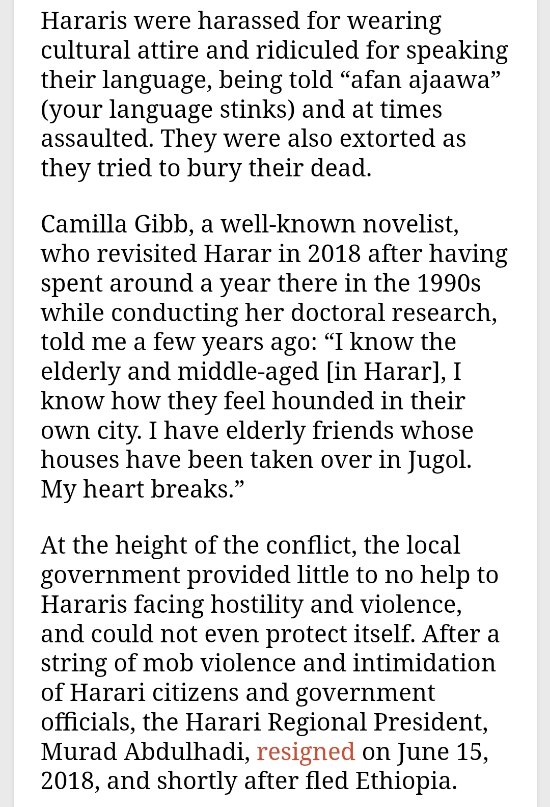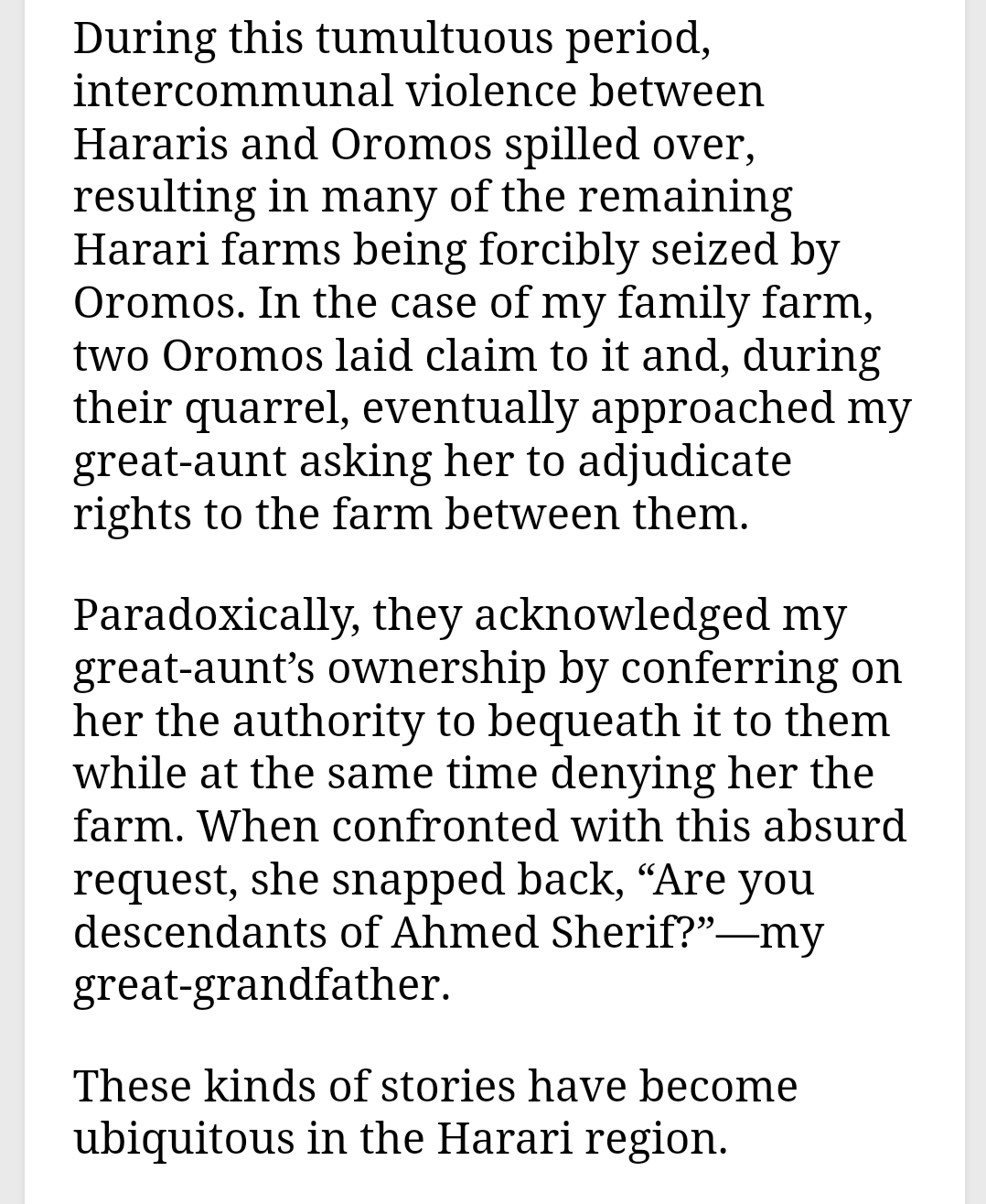 Think about it for a second, Hararis have been marginalised and abused by the Tigrayan elite for decades, allowing and even encouraging the encroachment of their lands from the Oromo, today the Oromos routinely harass and kill Hararis, take over their properties, sideline them from government positions, as well as telling them they are 'guests' in their own lands.