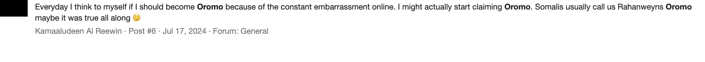 I caught a bunch of them on TikTok, trying to get Somalis to fight each other in the comment section about Oromo deportation. They know we have major internal issues and can be distracted against each other instead. But I think the tide is turning tbh especially as they have been exposed as ISIS operatives.