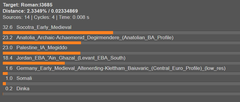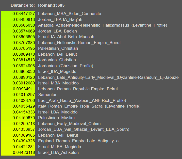 I3685 seems to have a significant Arab heritage. Probably Eastern Mediterranean mixed with southern Levant-Nabatean ancestry.
