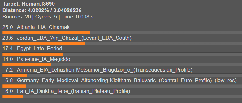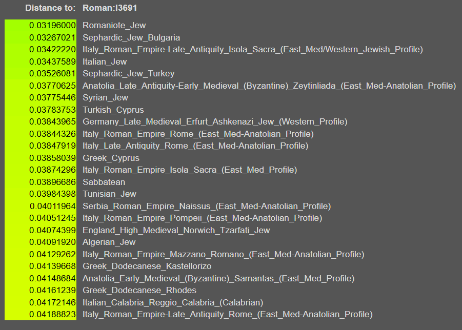 My statement still stands, a racist white today who identifies with Rome as a White European civilization would not even accept the average Roman as his kin. Racists apply the strictest sense of White, even when they don't fit into it themselves. Rome was indeed whiter (notice how I don't say they were White-proper) in its first establishment, but it became heterogeneous and then more and more relevant across the board. There is a reason why identity became loose and wealth distributed very diversified throughout and not specially preserved for people with less mixture. The irony is, that the initial non-Romans of the Italian outskirt regions would have a bigger East Mediterranean component but they were not even Roman, to begin with, similar to Pompeiians. Rome proper was highly mixed and they were the culture bearers and transformers. The definition of what was a Roman also changed several times and during the Pompeiian samples era, would have been Roman in every sense. Nationality and ethnicity as you frame them now were an obsolete concept at that time.