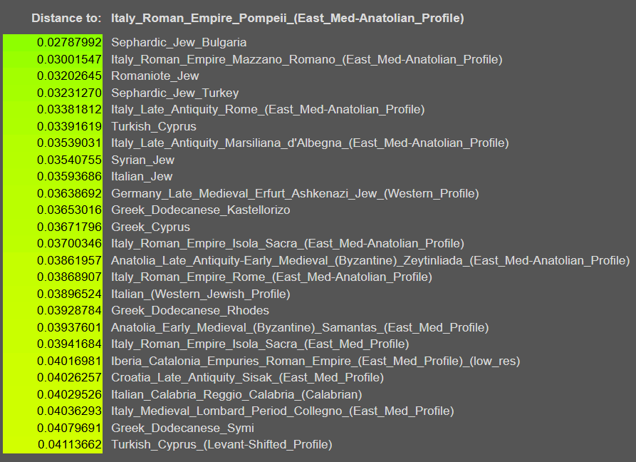 Secondly, the people of higher MENA origin were mixed and would usually be the wealthy ones and be Romans just as the ones with higher Italic ancestry. Remember, Rome expanded and absorbed and acculturated other peoples in the Italian mainland who were not even Roman themselves in the beginning, i.e., these Pompeii samples are as Roman as any East med profiled anywhere outside where Rome expanded which was basically the majority of Italy. The non-Latin Italic tribes were not more Romans than those Pompeiians who I must remind you are basically locals that mixed over time and had stronger cultural ties to Romans even before the domination. A crucial component is to recognize Pompeii at the time was Roman.