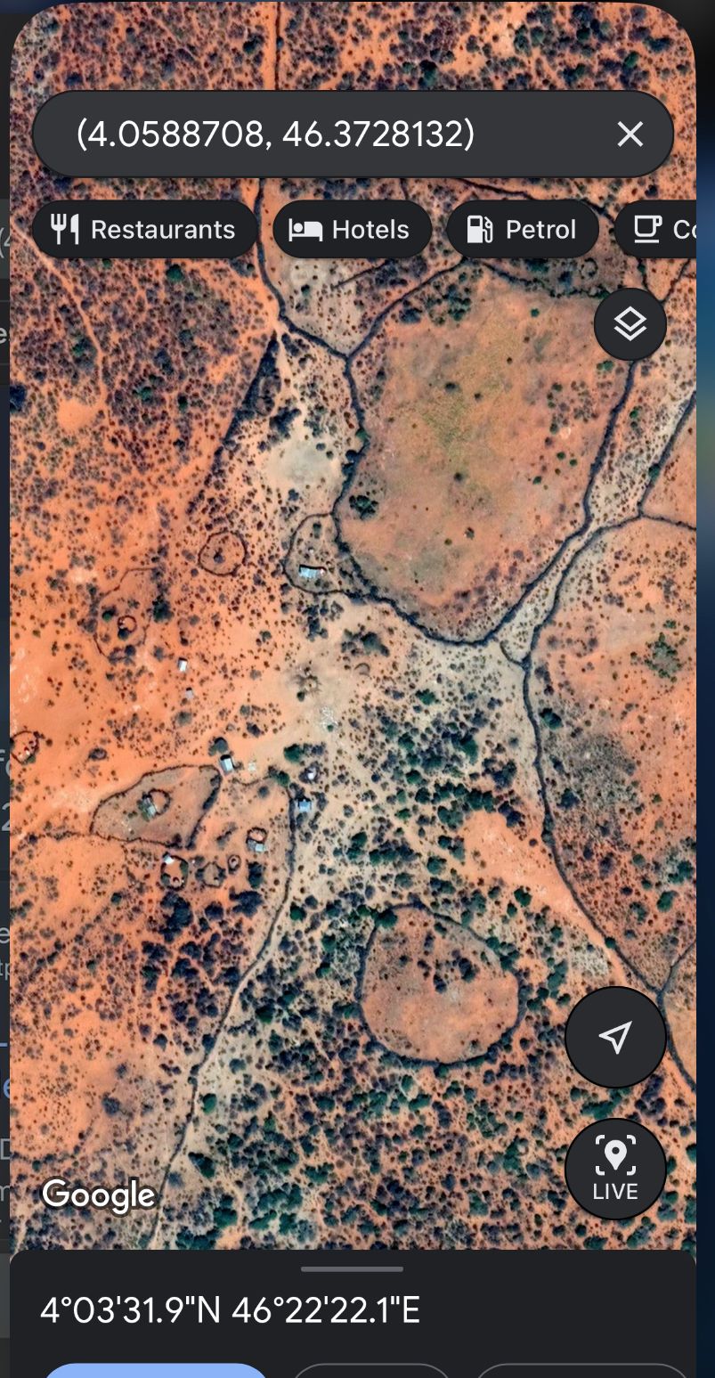 (4.0588708, 46.3728132)What? Take a picture of the tuulo bot in galgaduud. It doesn’t exist because there is only one in hiraan