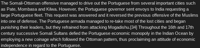 Good job, now Sofala is done for goodπŸ‘πŸΎYour own text clearly shows that they followed the ottomans who protected them and gave them guns. It's not because of mercy but because the Portuguese were after the whole East African coast, allowing them to settle was simply unthinkable, they would've go after them soon after. Whatever, none of your text support your claim of a Somali ruled Swahili coast, you definitely have reading issuesπŸ€“
