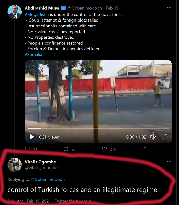 Kenyans are calling Farmaajo illegitimate regime after unsuccessful attempt to spark violence in Mogadishu. They are tripping over the Turkish support and protection of the FGS.