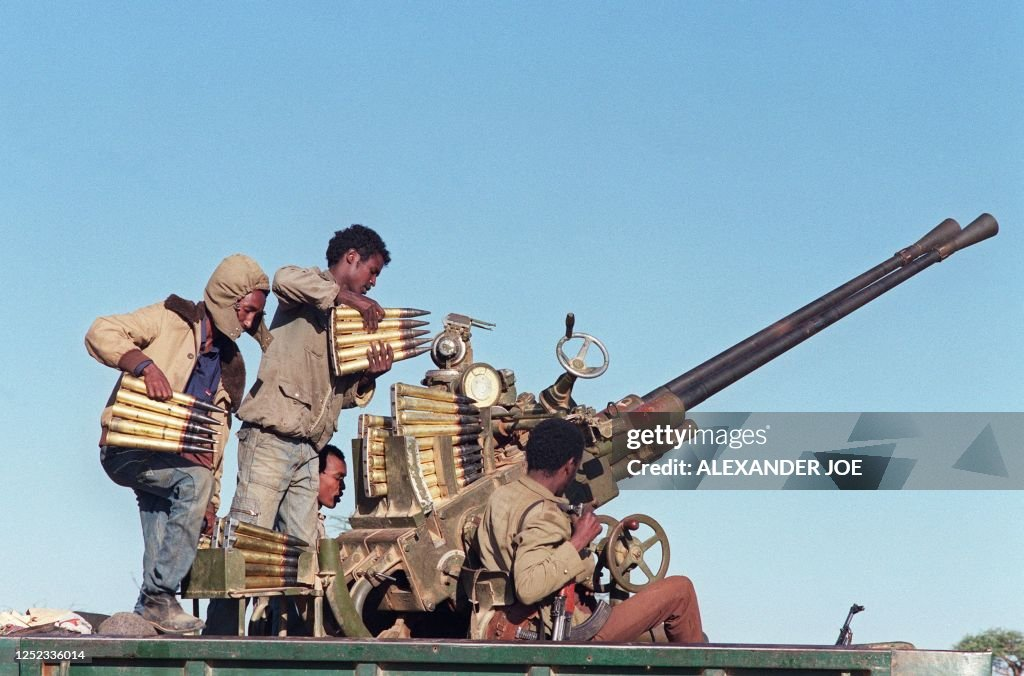 Rebel militiamen belonging to the Somali National Movement, fighting the regime of dictator Mohamed Siad Barre, load an anti-aircraft twins cannon near the town of Zeila, northern Somalia in October 1989.