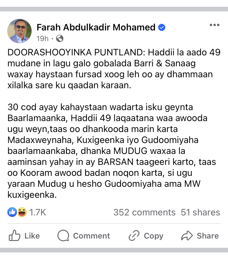 No need for dramatic outbursts. The SSC administration is too blame for their sudden and unitary decision 4 weeks before the election. The Garaads were in the middle of selecting their MPs, heck 11 MPs were already selected by the Garaads.