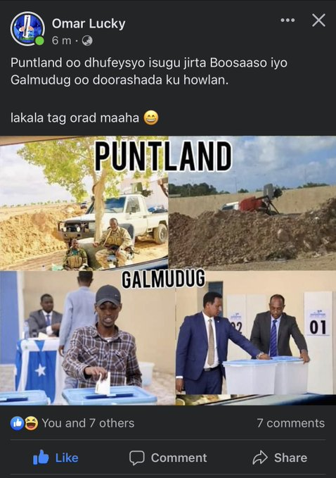 No one misses with Bah Dir RoobleIlmo Diyaano rag rag dhalay they have stopped damaca dictator Deni from stealing 16 seats in Bosaso. He has no chance against Farmaajo now and may cancel his bid for Villa Somalia 3D chess nikka