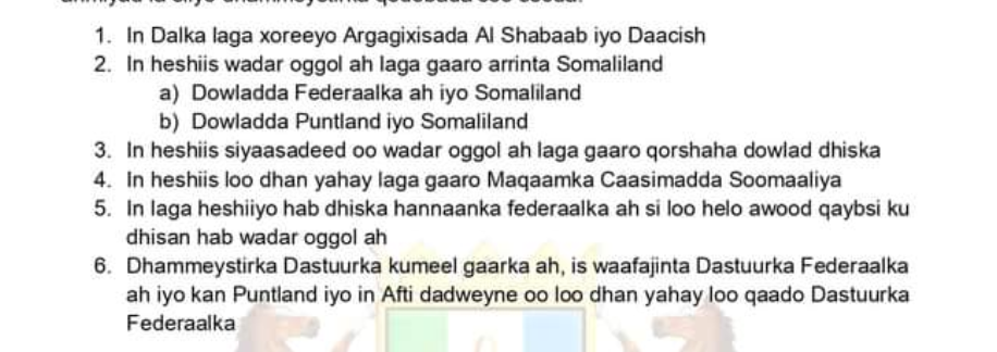 I'm quite sure the document states those six points are what should be addressed before PL can agree with FGS on ''Dhameystirka dhismaha hannaanka federaalka ah ee Dalka''.