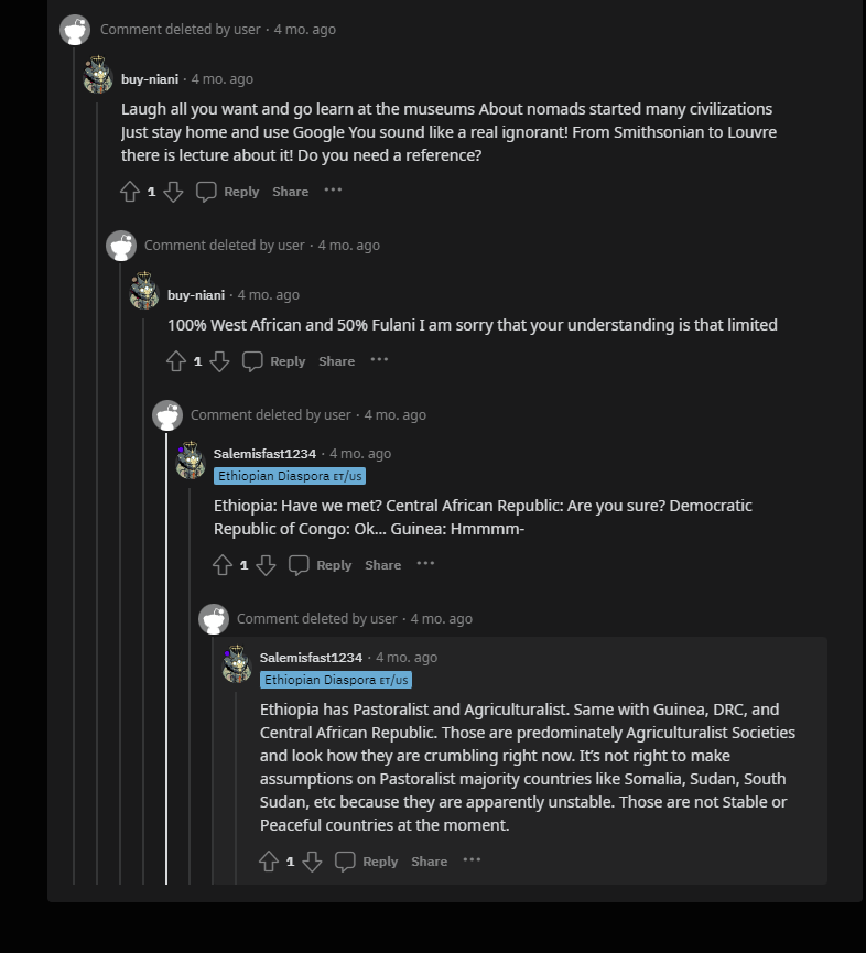 Here is my other post that instantly got removed by african mods because i was teaching Somali history. They are just a bunch of Niger-Congo supremacists... You will regularly see that whenever a north african makes a post (especially Egyptians) you will see a flood of madows telling them that they are not real africans and how they are just arab invaders.