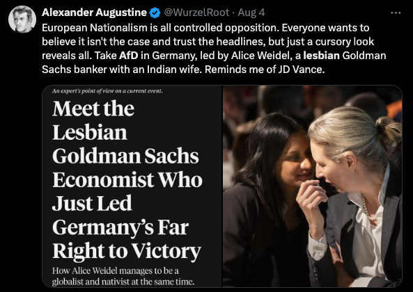 These far right groups are all controlled opposition, they will do nothing, if you want to see an example look at Meloni Italy or Geert Wilders Netherlands, Its all empty rhetoric, they haven't done anything or deported anyone, as for the AFD its even worse.