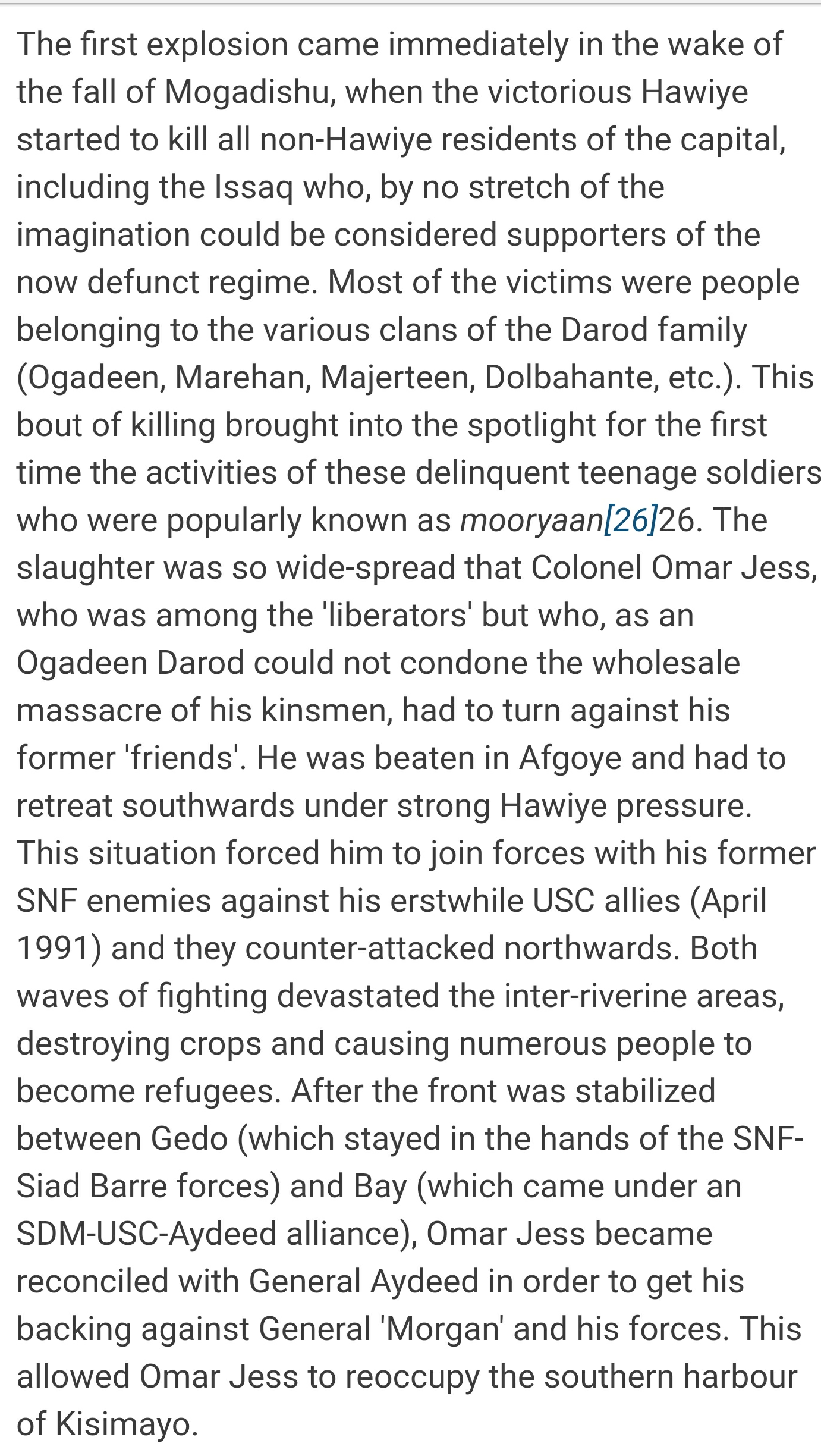 True but when "darood" captured the city back from Aydiid under "SPM", why was jees removed by morgan and gabyow? Any explanation for that?USC was in Kismayo as early as April, 1991 lol. And we all know who led them. The timeline of your little source is inaccurate.