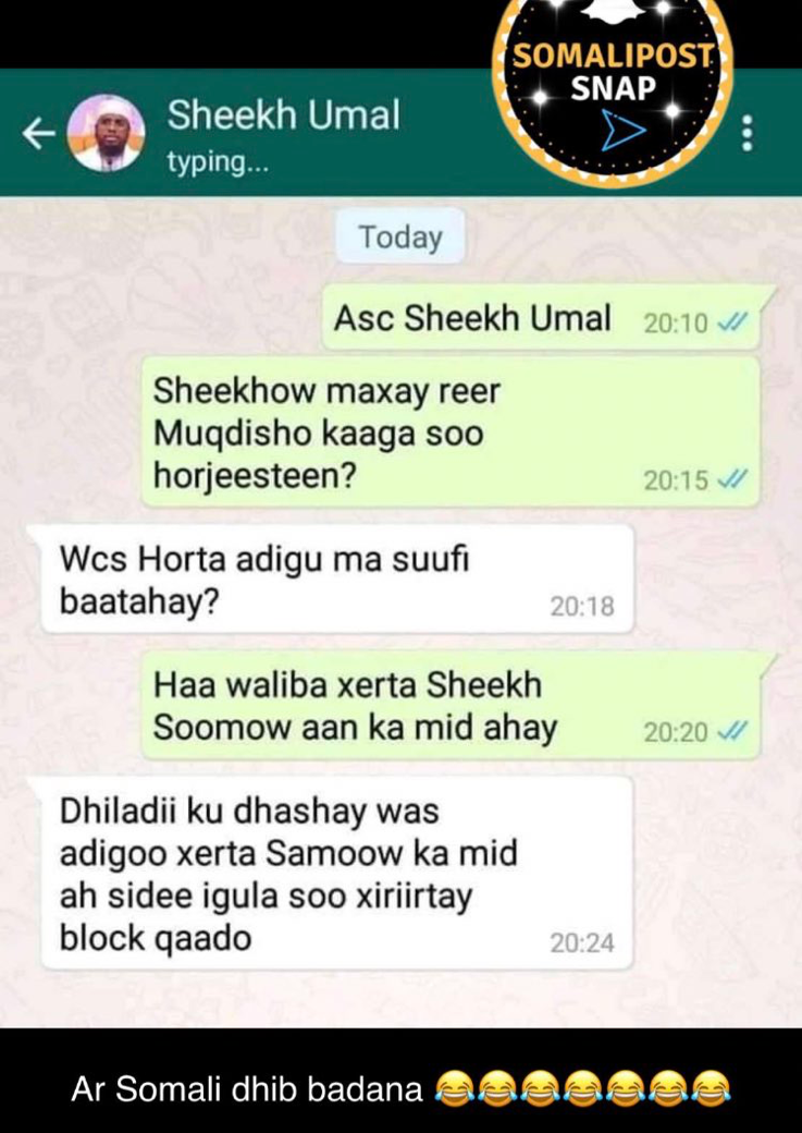 I don't mind those type of sheikhs hadu ku hadlayo wax 'aduunka ku saabsan' iyo 'mathamatics' isaga oo diinta ku difaacayo, waa arin kale. Lakin sheikh sharif oo kale wa macalin dugsi, all he ever did was teach quran like 'pastors' in America, no-one listens to pastors in America, imagine a pastor became a president. Well in Somalia sheikh sharif DID. That shows you how 'low' we are in 'reserves' of excellence when 'pastors' are presidential material. Religious people who are educated and following the system of the world are welcome, they will be judged on their 'solutions' using 'nidaam' lagu heeshiyay and I say 'scientific' because waa mid anaga oo dhan hos imaano runti.