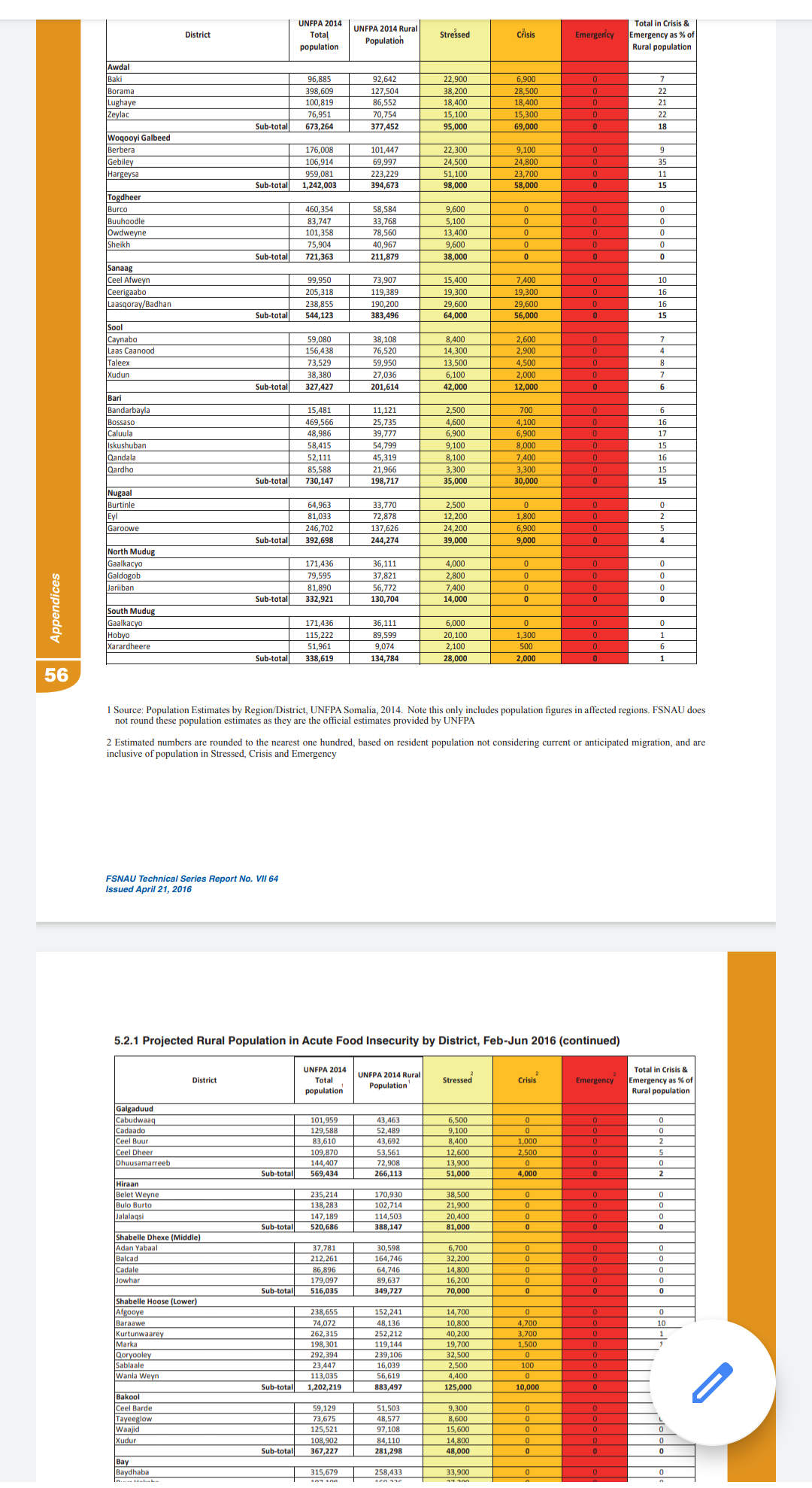 Buuhoodle (83,747)+ Whole of Sool except Ceynaba district (268,347), Laasqoray/Badhan (238,855), Bari (730,147), Nugaal (392,698), North Mudug except Galdogob (253,326)
