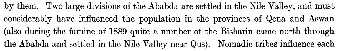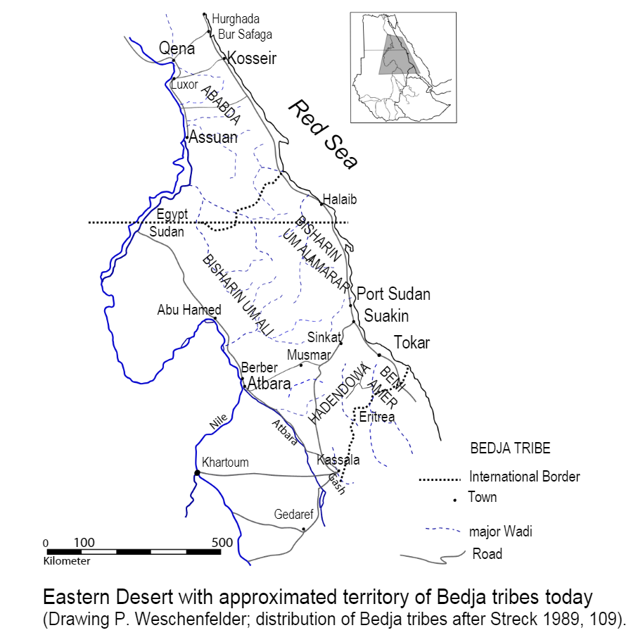 "The Egyptian Beja are divided into two tribes—the ʿAbābdah and the Bishārīn. The ʿAbābdah occupy the Eastern Desert south of a line between Qinā and Al-Ghardaqah; there are also several groups settled along the Nile between Aswān and Qinā."