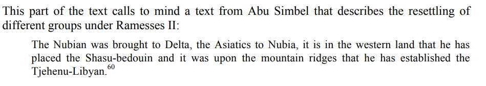 Those Ancient Egyptians won those conflicts and had a custom of taking the captives and relocating them completely else. For example, a group they called Shasu, i.e., Levantine Bedouin Semites, they sent to Libya. And guess where they sent the Nubians? To the Delta. My theory is that they sent them not only to the Delta but also to the far eastern reaches of that region, neighboring Beduin lands. Also, this was a practice of that time, so they might have sent Nubians directly to the Sinai.