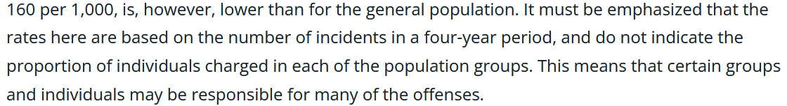 It is about how many crimes one person commits... You see the problem when they later say "400/1000" Somalis do crime, presenting it as 400 people out of 1000. In truth it is, likely an extremely high crime area, that has an extreme disproportion of youth since most of these are kids (remember, the national average has mostly adults being the bulk of the population - that is not the case for us. Our parental-age adults probably do not differ, or even maybe commit less crime than the average Norwegian, without conditioning the multivariate factors how, other cities outside the biggest ones, have way less crime. Then they erroneously put the name "Somali" beside the unrepresentative, highly skewed number that is present as if 1 out of 1000 represents one person.
