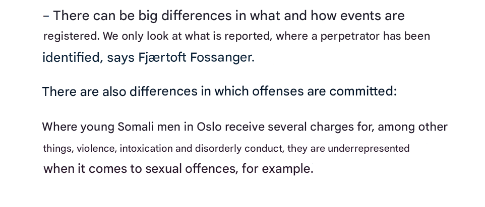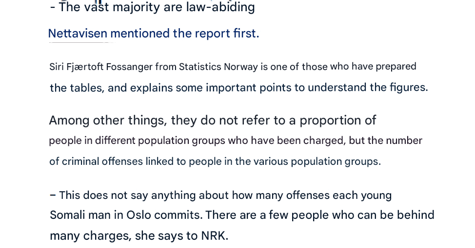 Also it doesn't make sense to use stats in Norway to fuel Elon Musk's sexual offender muslim grooming gang immigrant hate train because they say Somalis are under-represented in sexual offenses: