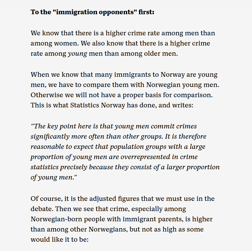 It also don't reflect any thing to do with lack of integration or hyper violent minority, or overrepresentation in particular. They are comparing the Somali immigrant population that are mainly made up of youth with other populations that are mainly made up of adults. When we know that youth in any population commit more crime than older adults, if you adjust for age and location Somali's and immigrants are not actually over represented in crime.