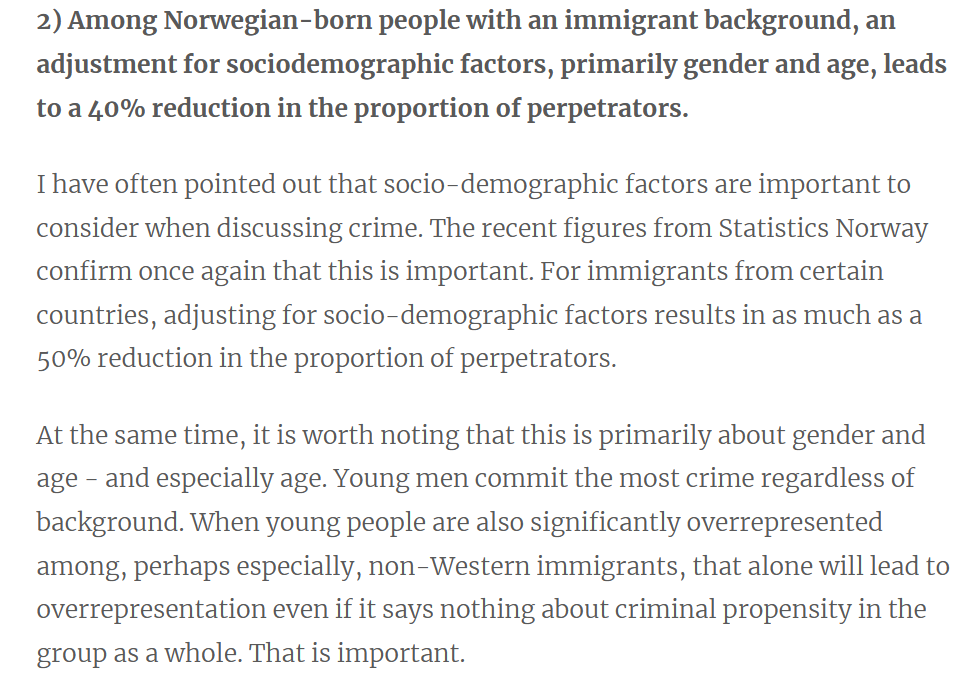 "En opplagt årsak til forskjeller i andelen gjerningspersoner både blant innvandrere og øvrig befolkning, på tvers av landbakgrunn og innvandringsgrunn, er at befolkningsgruppene er ulikt sammensatt både med hensyn til kjønn, alder og sosioøkonomiske kjennetegn (se kapittel 1 og 2). Helt sentralt her er at unge menn vesentlig oftere begår lovbrudd enn andre grupper. Det er følgelig rimelig å forvente at befolkningsgrupper med en stor andel unge menn er overrepresentert i kriminalstatistikken nettopp fordi de består av en større andel unge menn."
