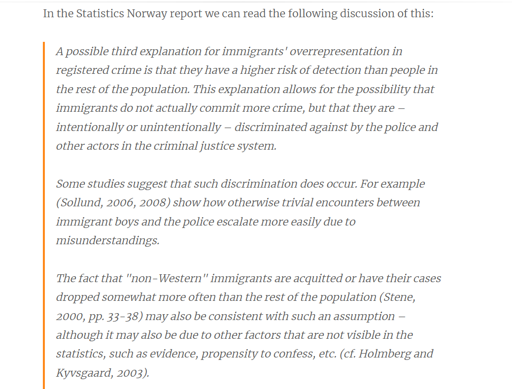 Also the same Norwegian statistics agency gives another added explanation and says it might not even show them committing more crime like i said earlier about allegations only that they are purposefully being accessed of it ''higher risk of detection''