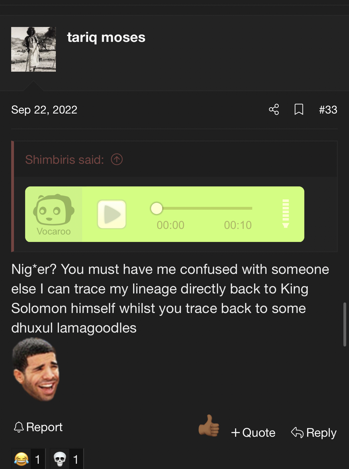 He’s not his old user name is @tariq mosesI wondered why you would make such a weird comment and then looked through your post history. You’re either shisheeye or full of self hate & retarded. Why are there all these male users who post in the culture & history forum and have all these 4chan type rw views on race? Why do they have a deep interest in Somali history & genetics but are also so self loathing? And why do they feel the need to come on here & project onto random Somalis?