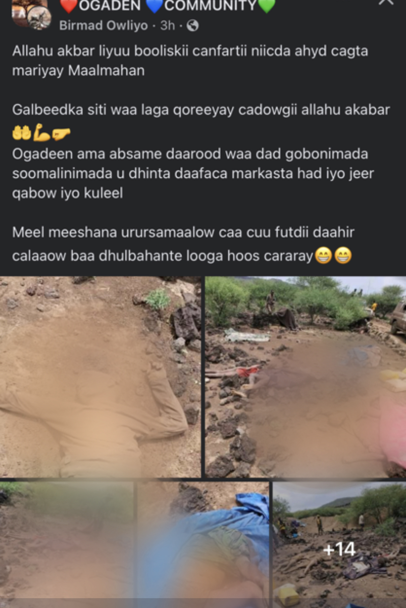Although Liyu helped they played minor role, the heavy lifting was done by SDF, beesha Ciise are by far the most organised Somali group, they have been holding countless shirars and organising funds for the Sitti defence forces for months, alxamdulillah its starting to bear fruits. If the Federal forces do not involve themselves Ciise of Ethiopia will always wipe the floor with the canfaar. I'm not trying to be disrespectful but this thread is quite dishonest if you are labeling this as a Liyuu win.For spiritual reasons I will not post the blurred images because of Ramadan, but there are many similar posts being shared on social media.