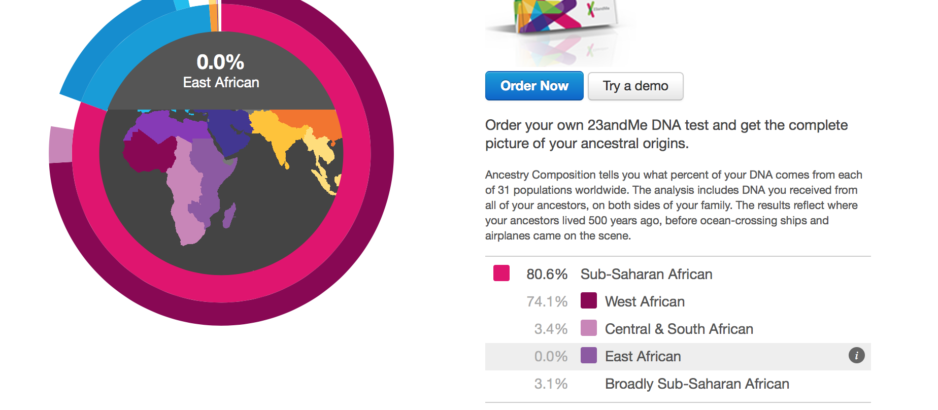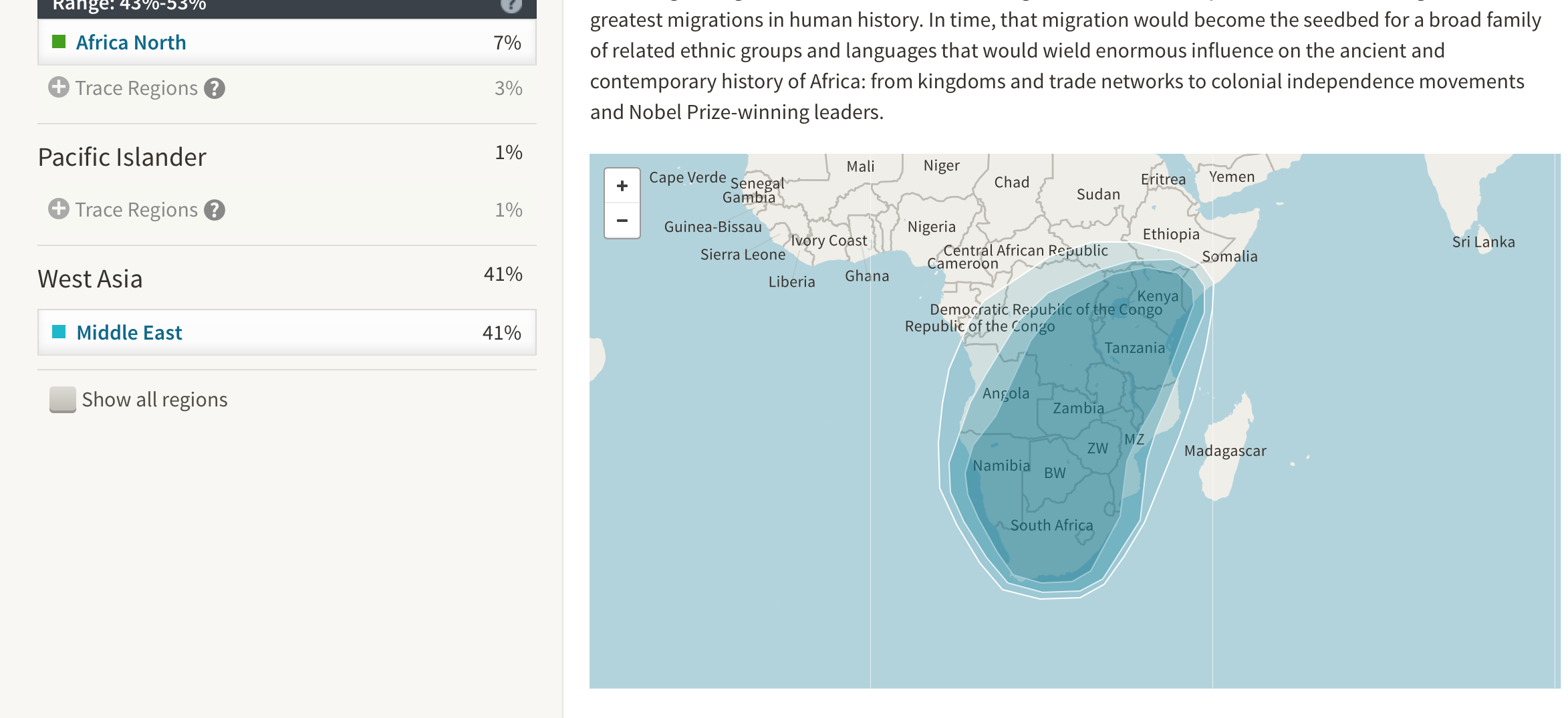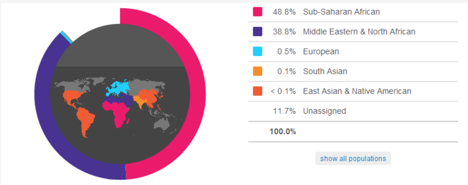 But the interesting thing is that you're right, every Somali who takes the test has similar results. Why is that? There has to be something to it. I don't think the people at the lab took my spit sample and knew my ethnicity and gave me what other Somalis get. There are similar traits in us and they have common genetic traits as people living in the Middle East as well as Africa! When did this all happen in our history.