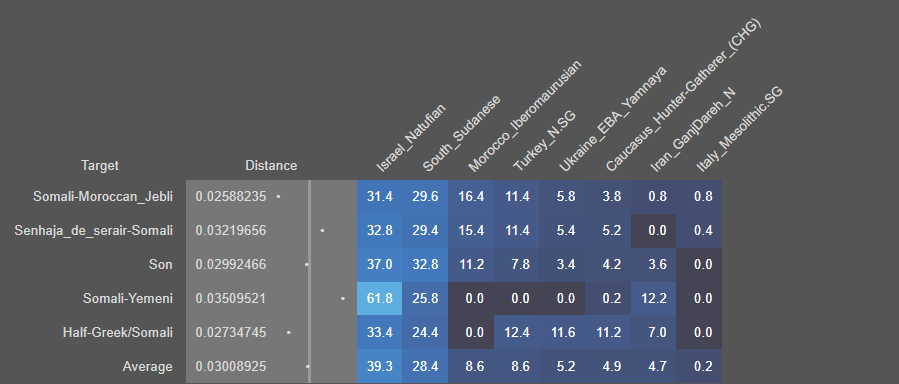 My son is a quarter Fassi (heavily European Jewish) which is why he even gets 3% Steppe ancestry despite being half Somali and quarter Southern Moroccan.He still has less Steppe than the half Somali-half North Moroccan Berber sims. My son is also more Natufian and more SSA than them.