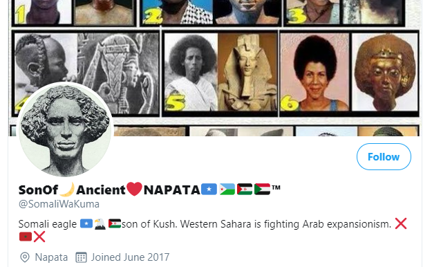 Look at his username, the flags in his name and bio, the twitter background picture, this is the perfect example of the Somali Hotep