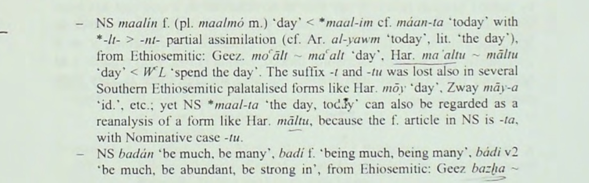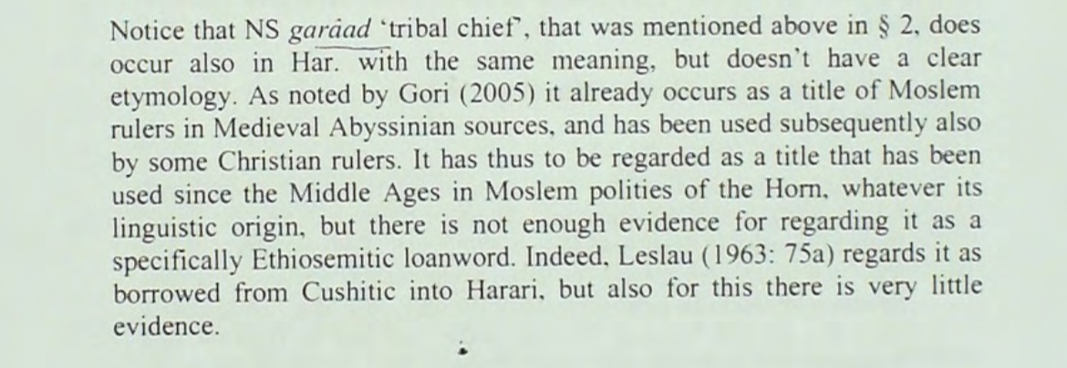 Combined, the Somali language in its entirety is almost entirely composed of Semitic words either from Sabaen, ethiosemitic languages (mostly southern) or directly from Arabic itself. This paired with the linguistic structure of the Somali language I think itโs fair to say our language is Semitic. I could go on longer about the differences in stratum between Somali and a few other Cushitic languages but this post is long enough already. I will tackle it in another post Insha Allah